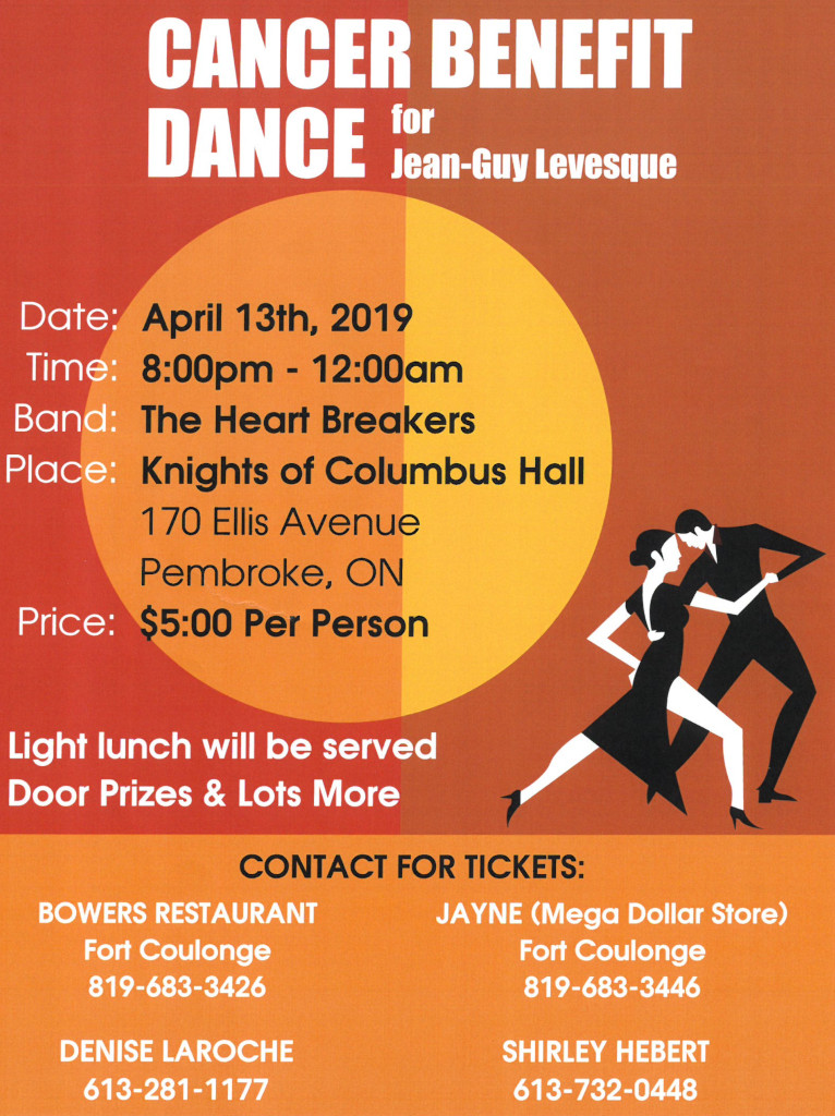A fundraiser to support Jean-Guy Lévesque who was recently diagnosed with cancer will be held in Pembroke on April 13th at the Knights of Columbus hall at 170 Ellis Ave. People are invited to attend the Hearthbreakers’ performance. It’s $5 per person and the event will take place from 8pm until midnight.