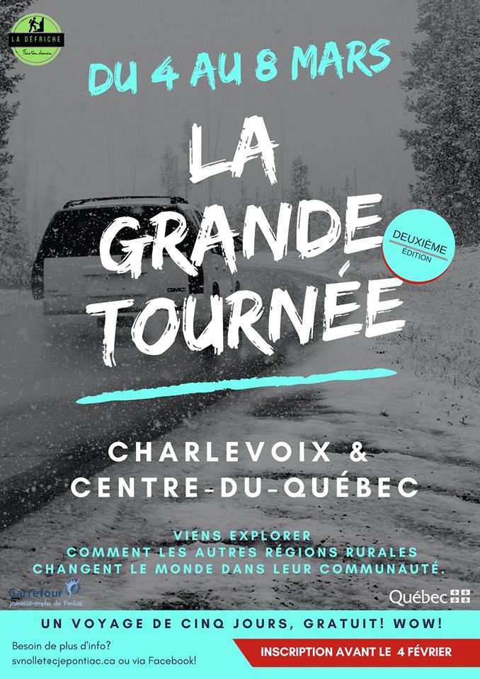 Young people between the ages of 18 and 29 will have the chance, in March, to participate in the second wave of the La Grande Tournée project with La Défriche du Carrefour Jeunesse-Emploi du Pontiac. Accompanied by program coordinators, these young adults will spend five days in the regions of Charlevoix and Centre-du-Québec to meet […]