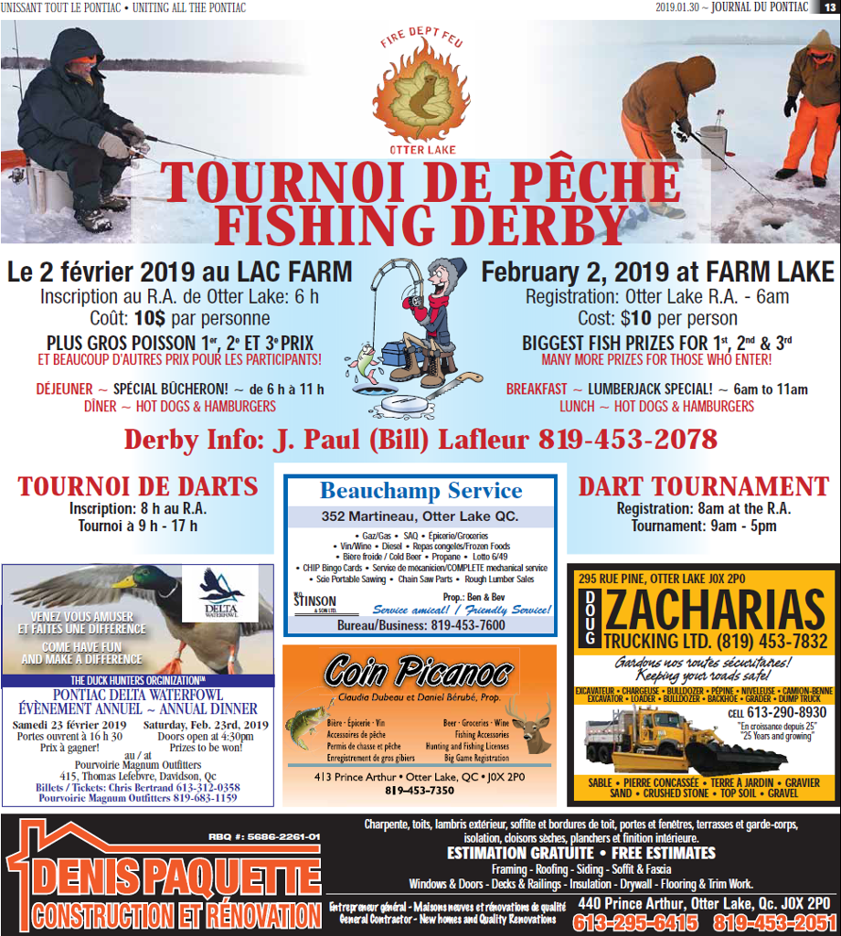 The annual Fishing Derby organized by the Otter Lake Fire department will be held this Saturday, February 2nd, at Farm Lake in the municipality of Otter Lake at 6am. The key organizer of the Derby, Jean-Paul Lafleur gave more details: There’s also a dart tournament on site, registration is at 8am and the tournament is […]